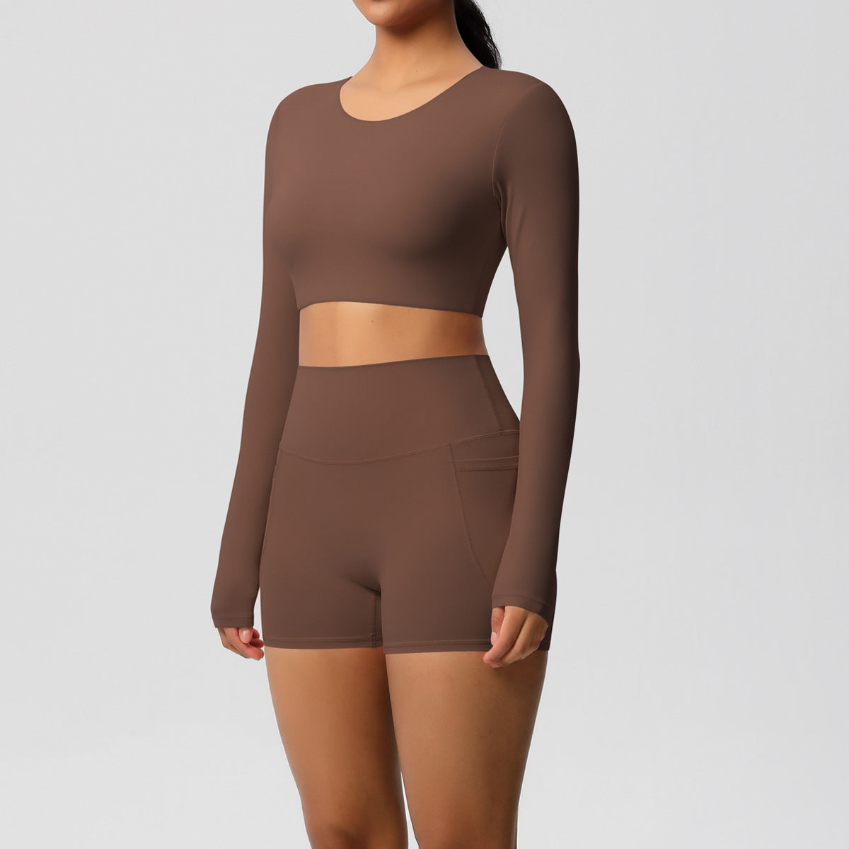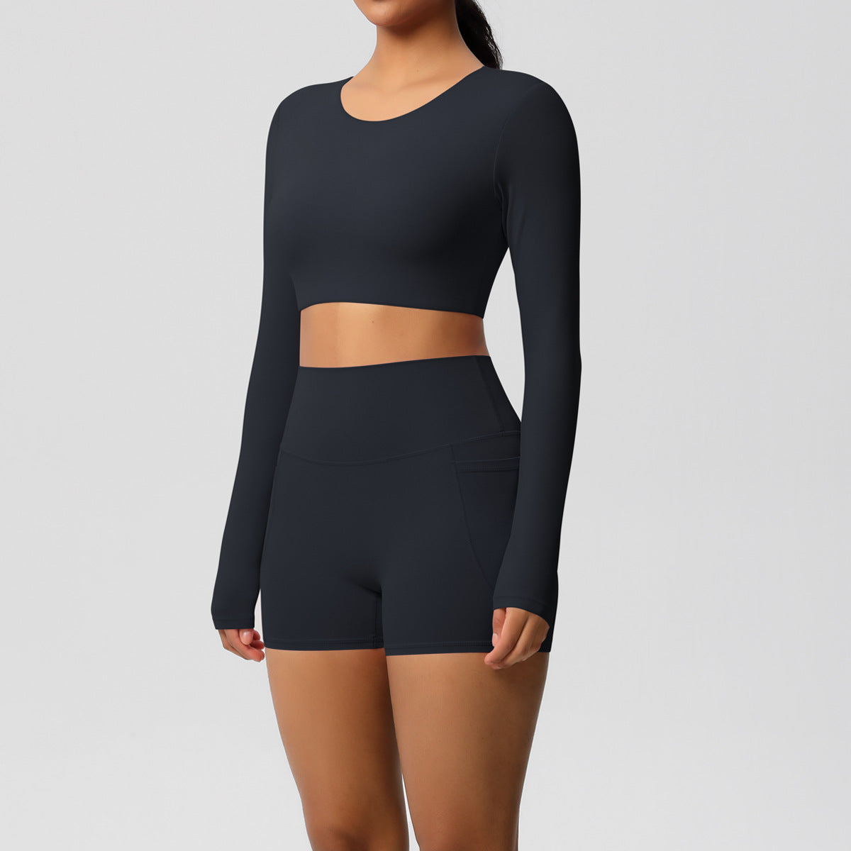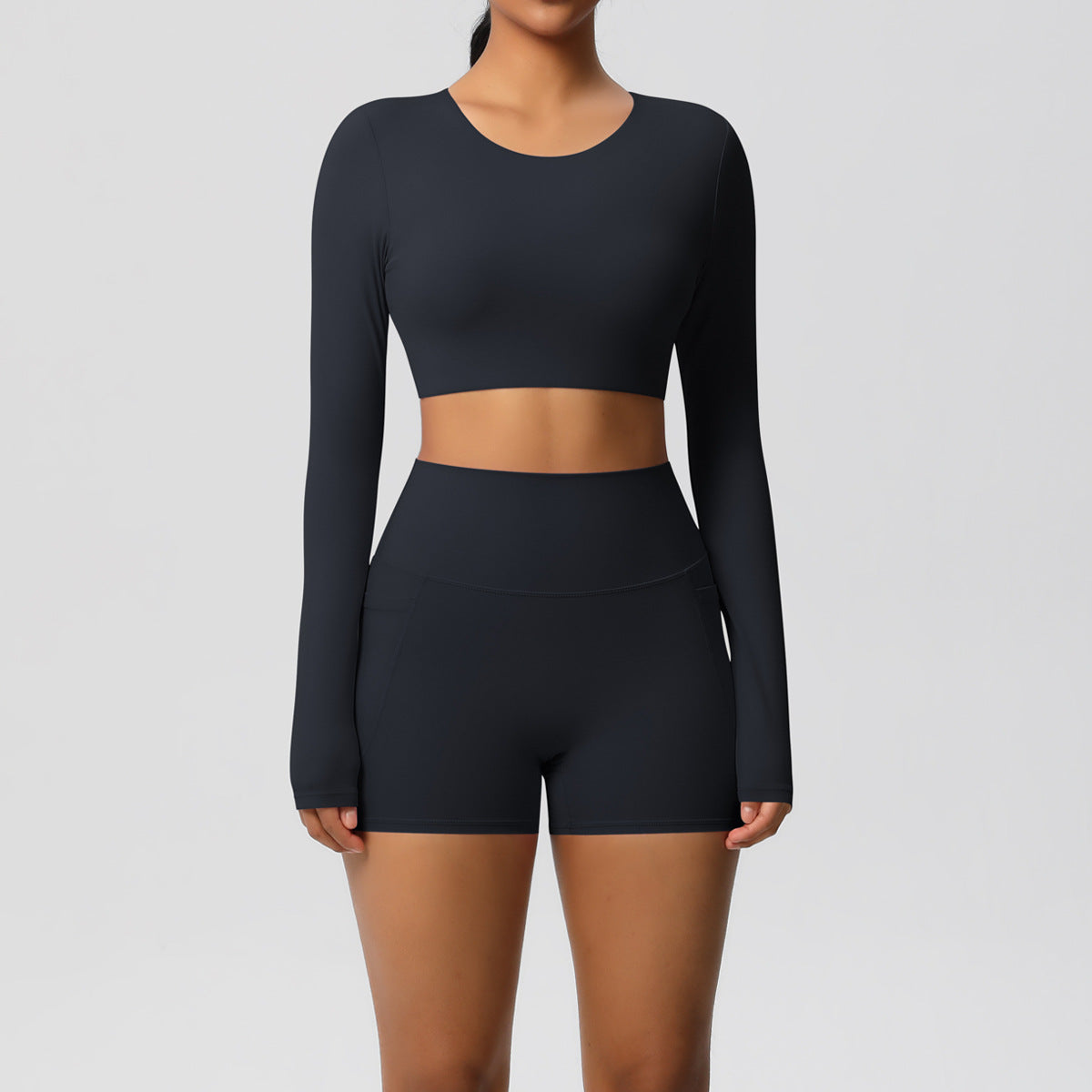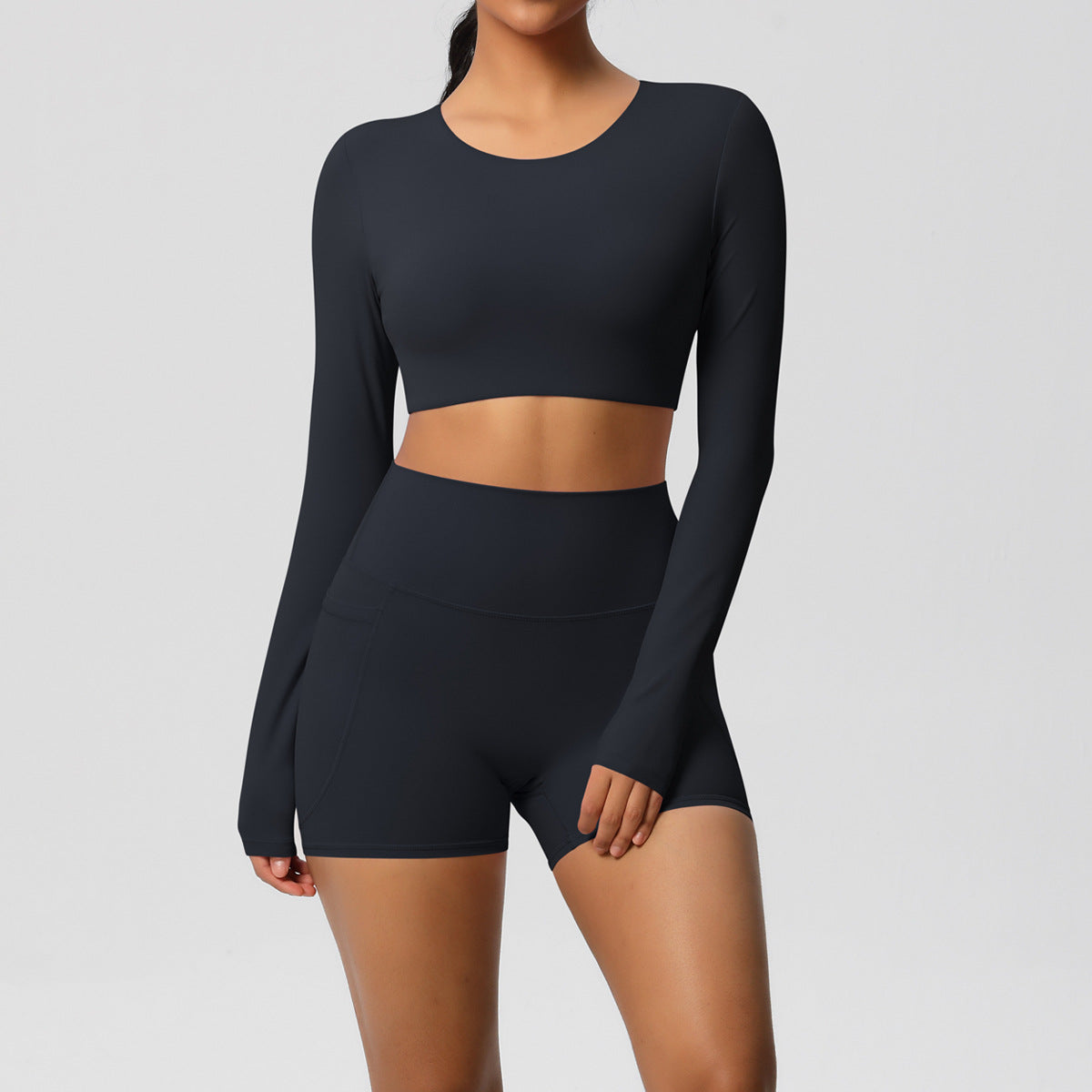 With its long sleeves and high-rise design, this set is perfect for any season. The solid pattern adds a touch of elegance, while the convenient pocket enhances practicality. Experience the perfect balance of fashion and performance with this exceptional yoga set, designed for those who value both style and comfort.