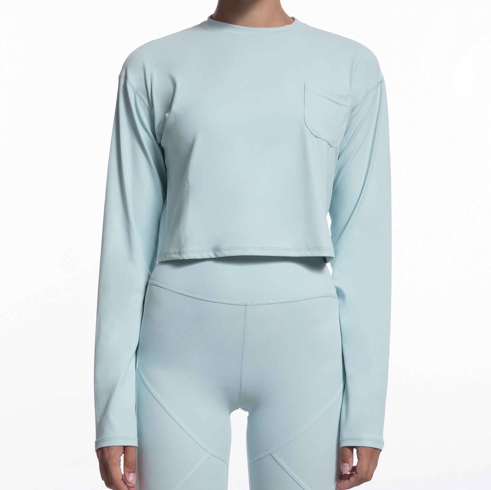 Its solid pattern and cropped length make it a versatile addition to any wardrobe, perfect for layering or wearing solo. The long sleeves provide a chic contrast, while the functional pocket adds a practical touch. Ideal for any season, this top is designed for those who appreciate both fashion and functionality.